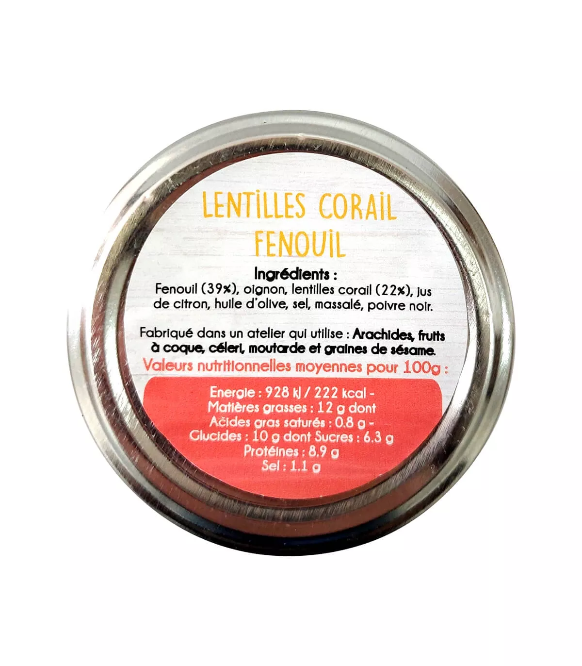 Oignons, Lentilles corail (27%), fenouil (21%), huile d'olive, jus de citron, sel, massalé, poivre noir.