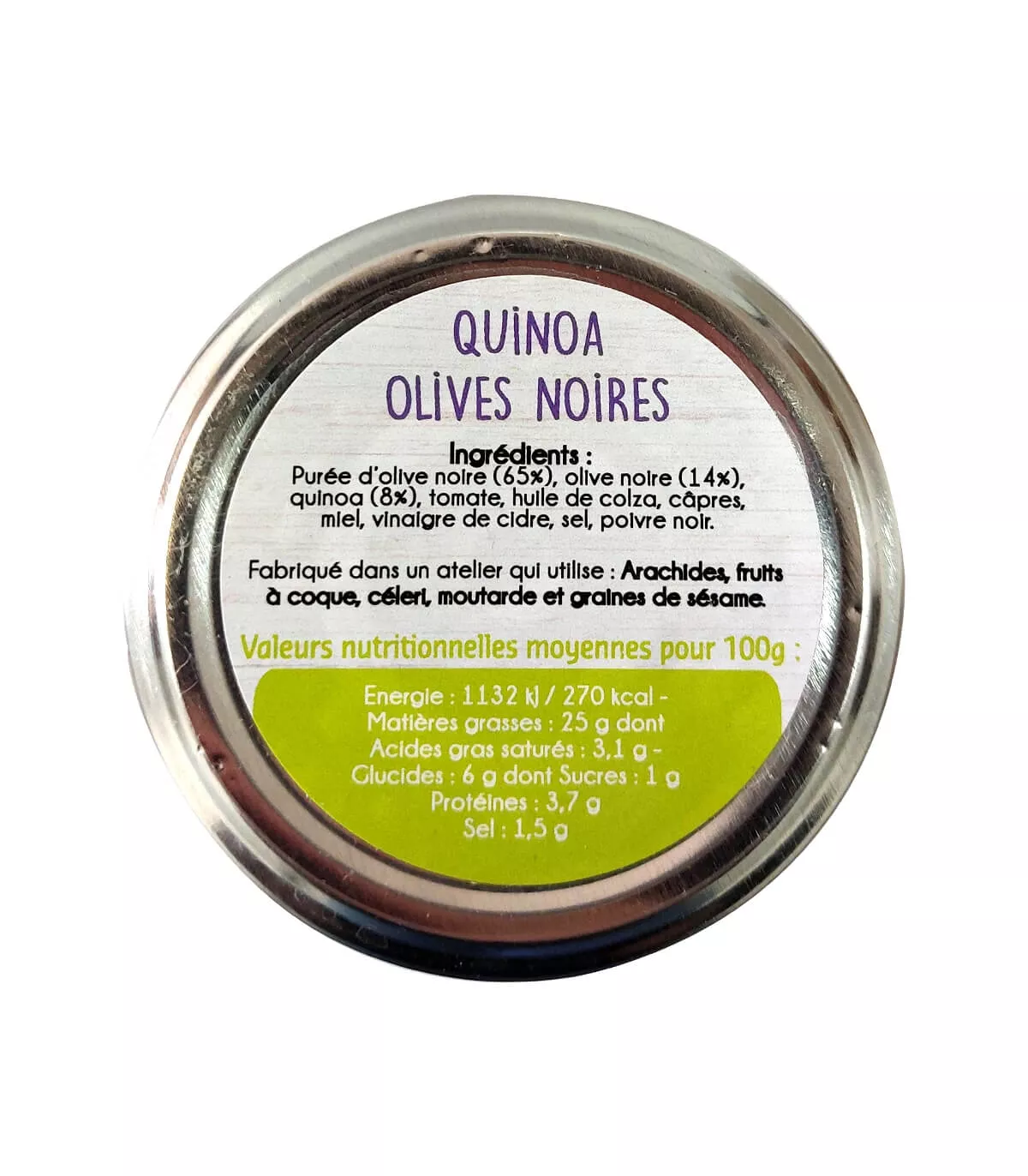 Purée d'olives noires (olives noires, huile d'olive, huile de colza, câpres, sel, arôme naturel (herbes de Provence)) (53%), quinoa (13%), huile d'olive, olives noires (7%), tomate séchée, vinaigre de cidre, sel, poivre noir.