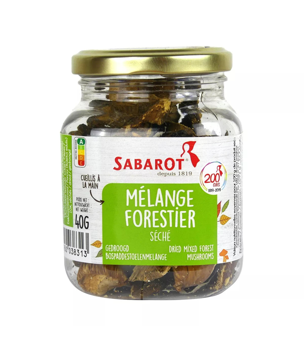 Le mélange forestier Sabarot est composé de bolets, pleurotes, champignons noirs et cèpes. Il est délicieux pour parfumer un risotto, une purée ou une soupe. N'hésitez pas à utiliser l'eau de réhydratation pour concentrer encore les goûts. Depuis plus de 30 ans, Sabarot crée, partout dans le monde, des filières afin de garantir la qualité et les origines de ses champignons. Tous les champignons Sabarot sont rigoureusement sélectionnés avant d’être conditionnés en France, dans le département de la Haute-Loire, au cœur de l’Auvergne. L’objectif premier de Sabarot reste la production haut de gamme de produits du terroir, conformément à la tradition de l’entreprise et à la réputation gastronomique de la région.