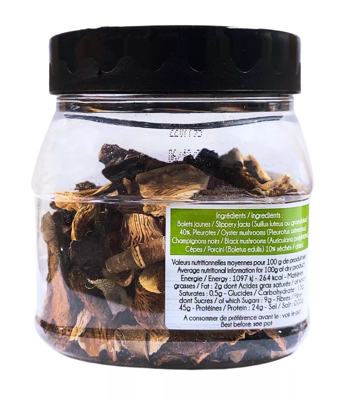 Le mélange forestier Sabarot est composé de bolets, pleurotes, champignons noirs et cèpes. Il est délicieux pour parfumer un risotto, une purée ou une soupe. N'hésitez pas à utiliser l'eau de réhydratation pour concentrer encore les goûts. Depuis plus de 30 ans, Sabarot crée, partout dans le monde, des filières afin de garantir la qualité et les origines de ses champignons. Tous les champignons Sabarot sont rigoureusement sélectionnés avant d’être conditionnés en France, dans le département de la Haute-Loire, au cœur de l’Auvergne. L’objectif premier de Sabarot reste la production haut de gamme de produits du terroir, conformément à la tradition de l’entreprise et à la réputation gastronomique de la région.