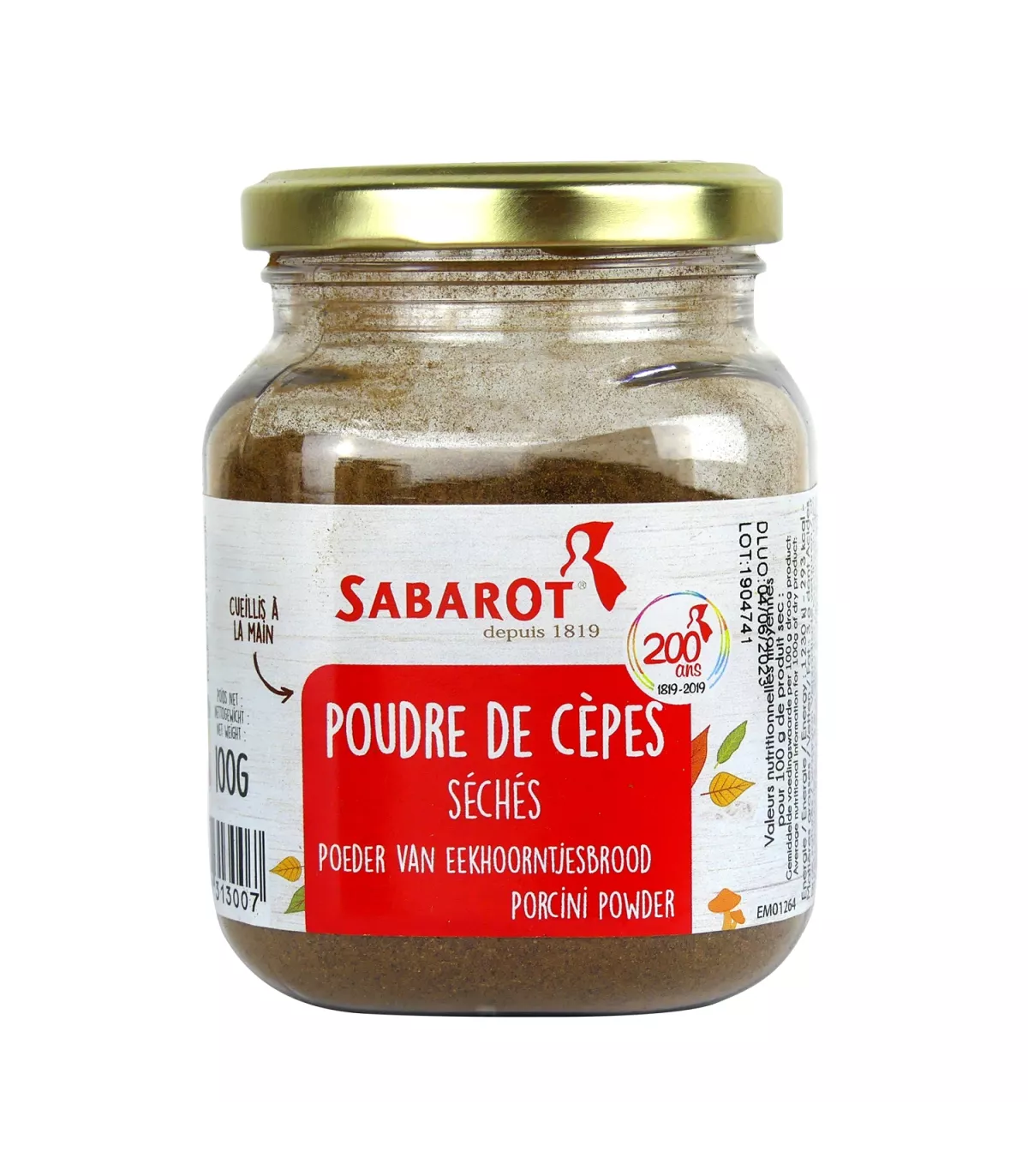 La poudre de cèpes Sabarot parfume d'une cuillerée toutes vos préparations : fondues, soupes, gratins, purées, sauces et même dessert (fondant au chocolat, chantilly...) d'un bon goût de cèpes. Depuis plus de 30 ans, Sabarot crée, partout dans le monde, des filières afin de garantir la qualité et les origines de ses champignons. Tous les champignons Sabarot sont rigoureusement sélectionnés avant d’être conditionnés en France, dans le département de la Haute-Loire, au cœur de l’Auvergne. L’objectif premier de Sabarot reste la production haut de gamme de produits du terroir, conformément à la tradition de l’entreprise et à la réputation gastronomique de la région.