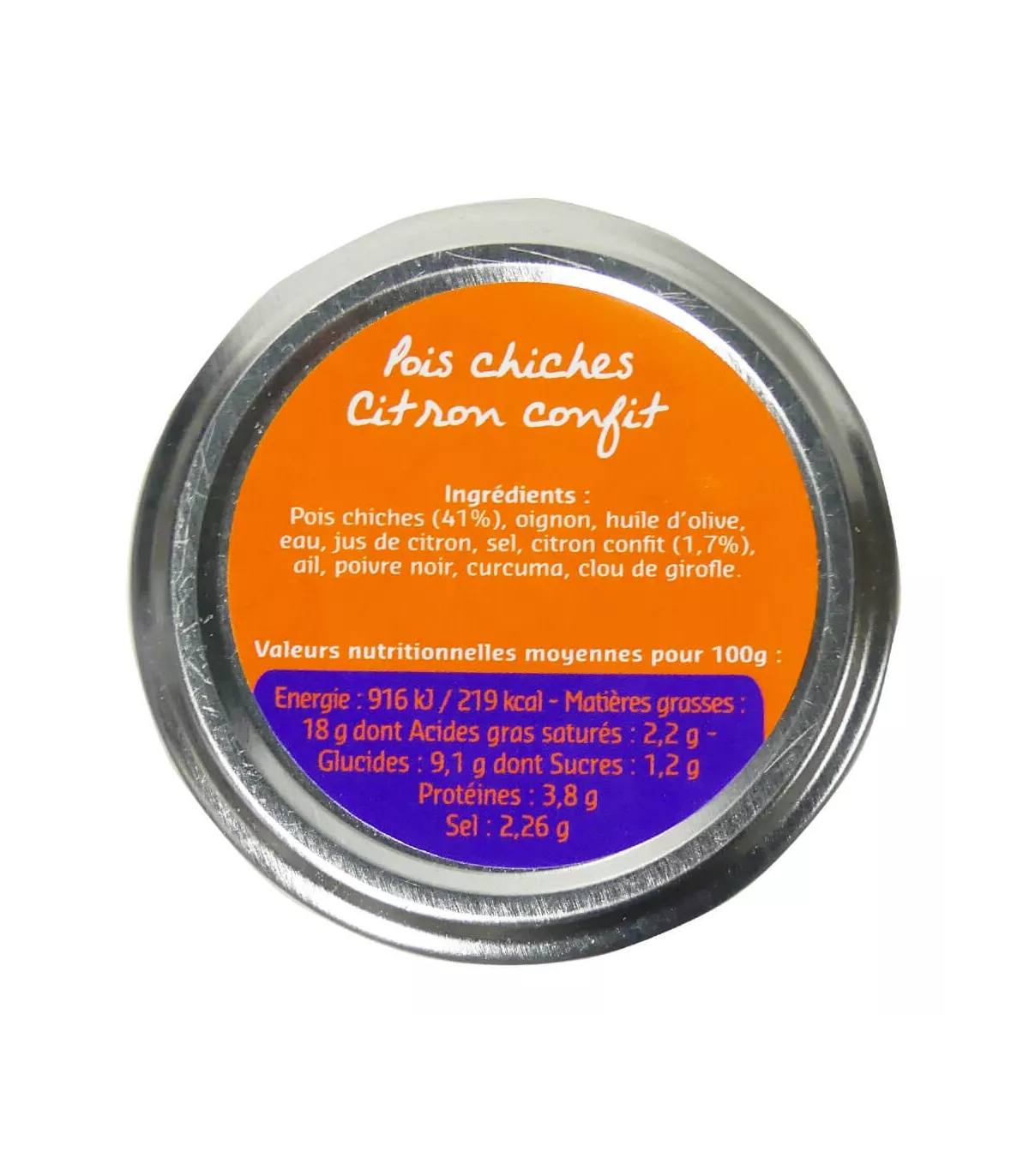 Chickpeas (41%), onion, olive oil, water, lemon juice, salt, preserved lemon (1.7%), garlic, black pepper, turmeric, clove.