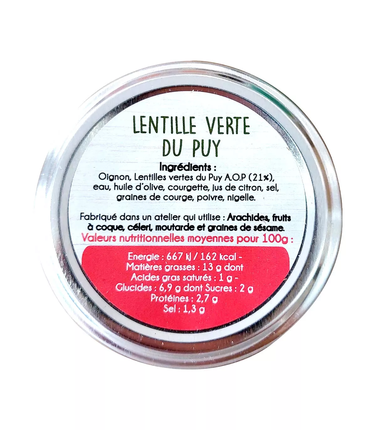 Onion, Green lentils du Puy A.O.P. (21%), water, olive oil, zucchini, lemon juice, salt, pumpkin seeds, pepper, nigella.