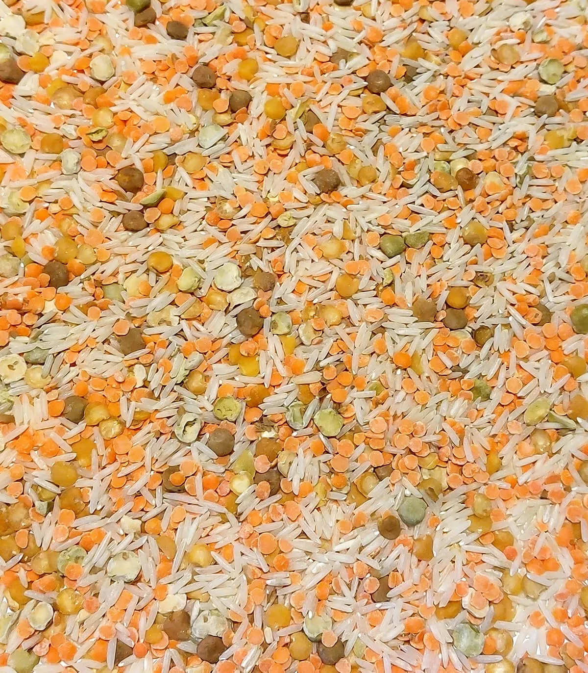 Parboiled basmati rice (50%), coral lentils (25%), pre-cooked blonde lentils (15%), pre-cooked split peas (10%).