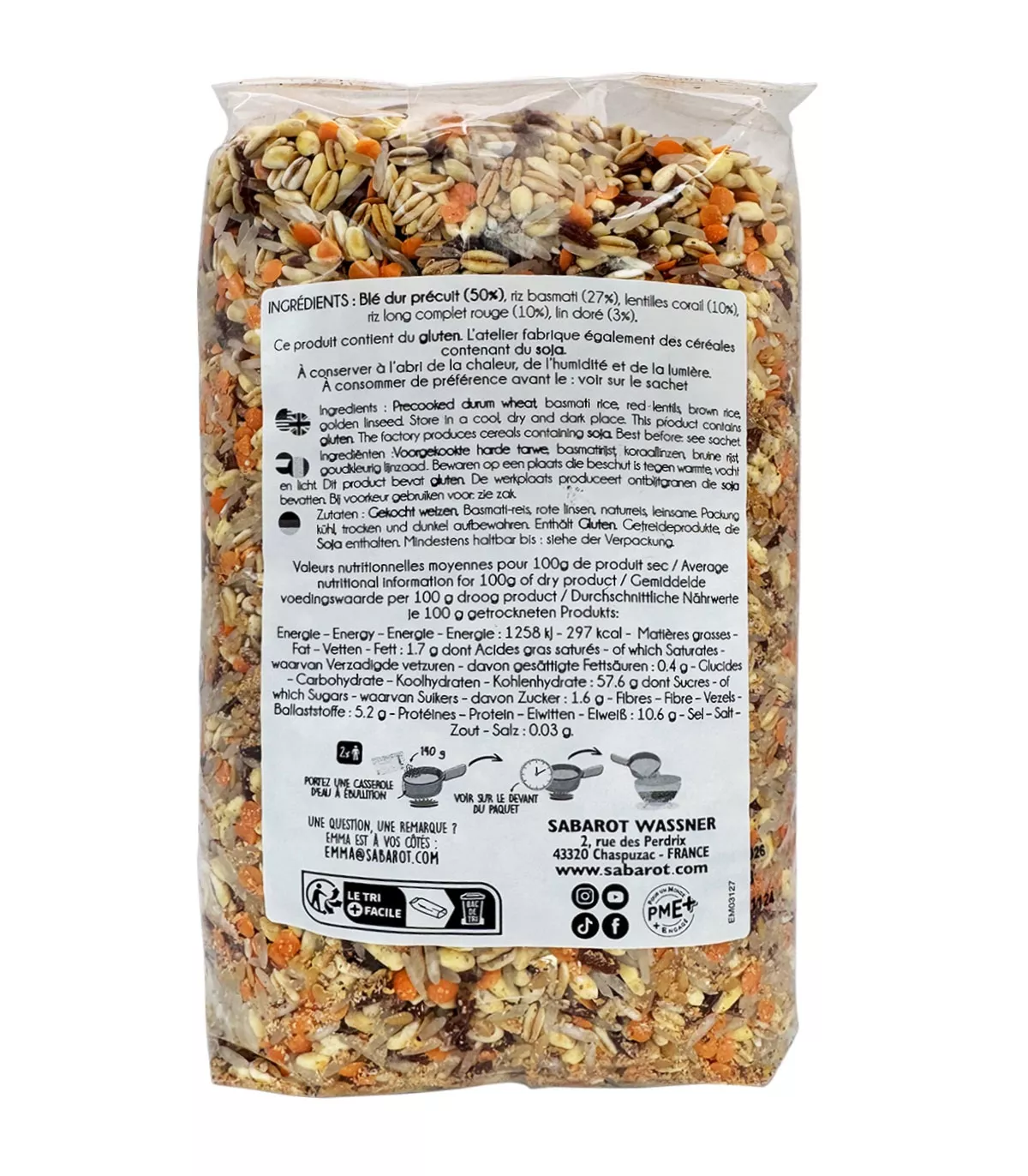 Discover exclusively the new Sabarot cereal mixes. The 5 seeds mix cleverly combines wheat, basmati rice, coral lentil, red rice, and flaxseed for a delicious and original result. The ways to cook this mix range from the most basic to the most sophisticated. It can accompany fish, poultry, grilled meats, mixed with vegetables, or in a composed salad.