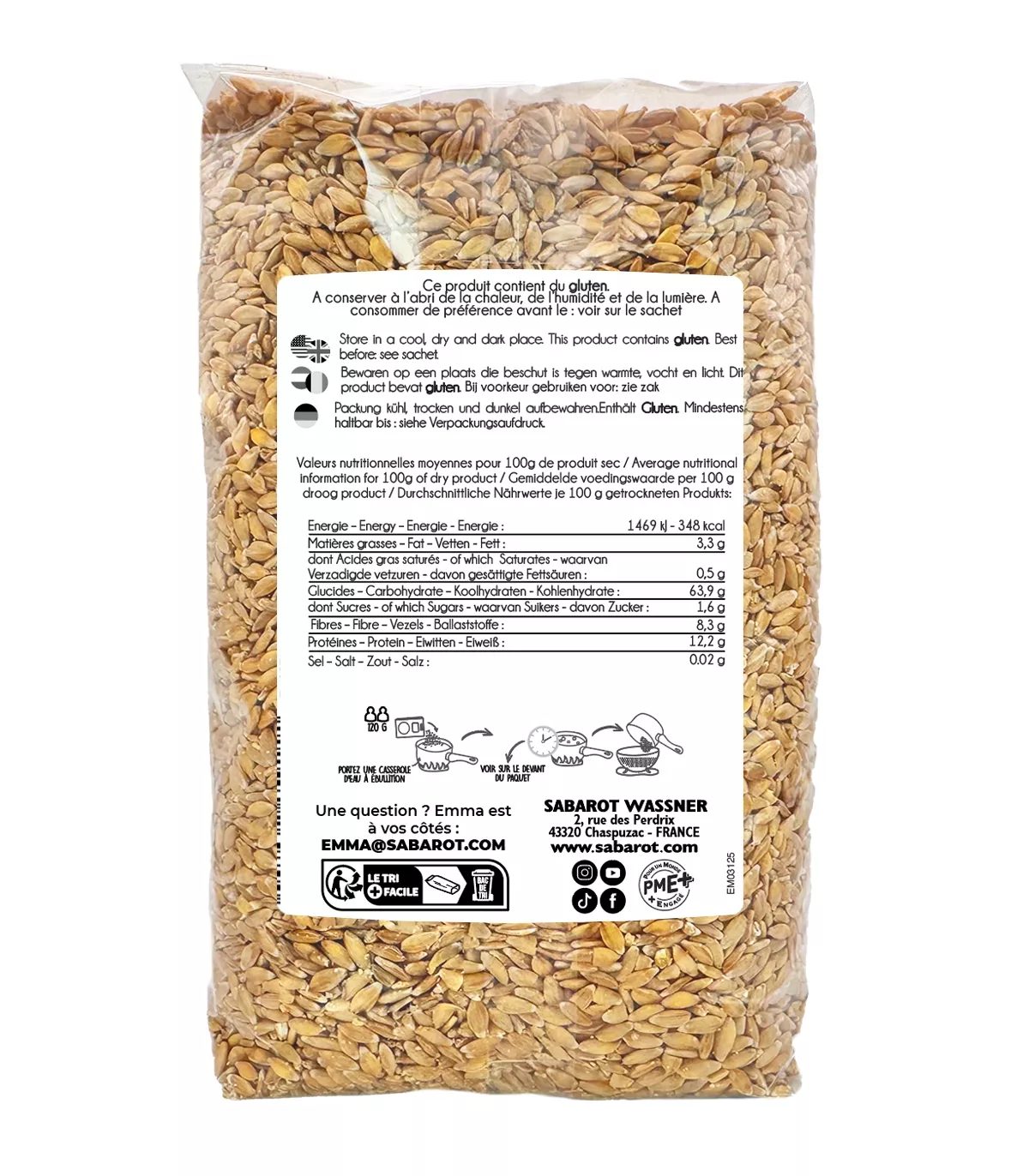 Cultivated on the high plateaus of Velay, at more than 800 meters altitude in Auvergne, the Einkorn from Velay is an ancient grain brought back to the forefront by Sabarot. This cereal of excellent nutritional quality is an alternative to pasta and rice. Rich in proteins, a source of vitamins and minerals, the Einkorn from Velay is high in fiber and low in gluten. Its 40-minute cooking time gives it an ideal texture for risotto or soup, for example. But it will also allow you to create a thousand and one easy and quick recipes: appetizer, main course, or even dessert. Its nutty taste and melting texture in the mouth will keep surprising you.