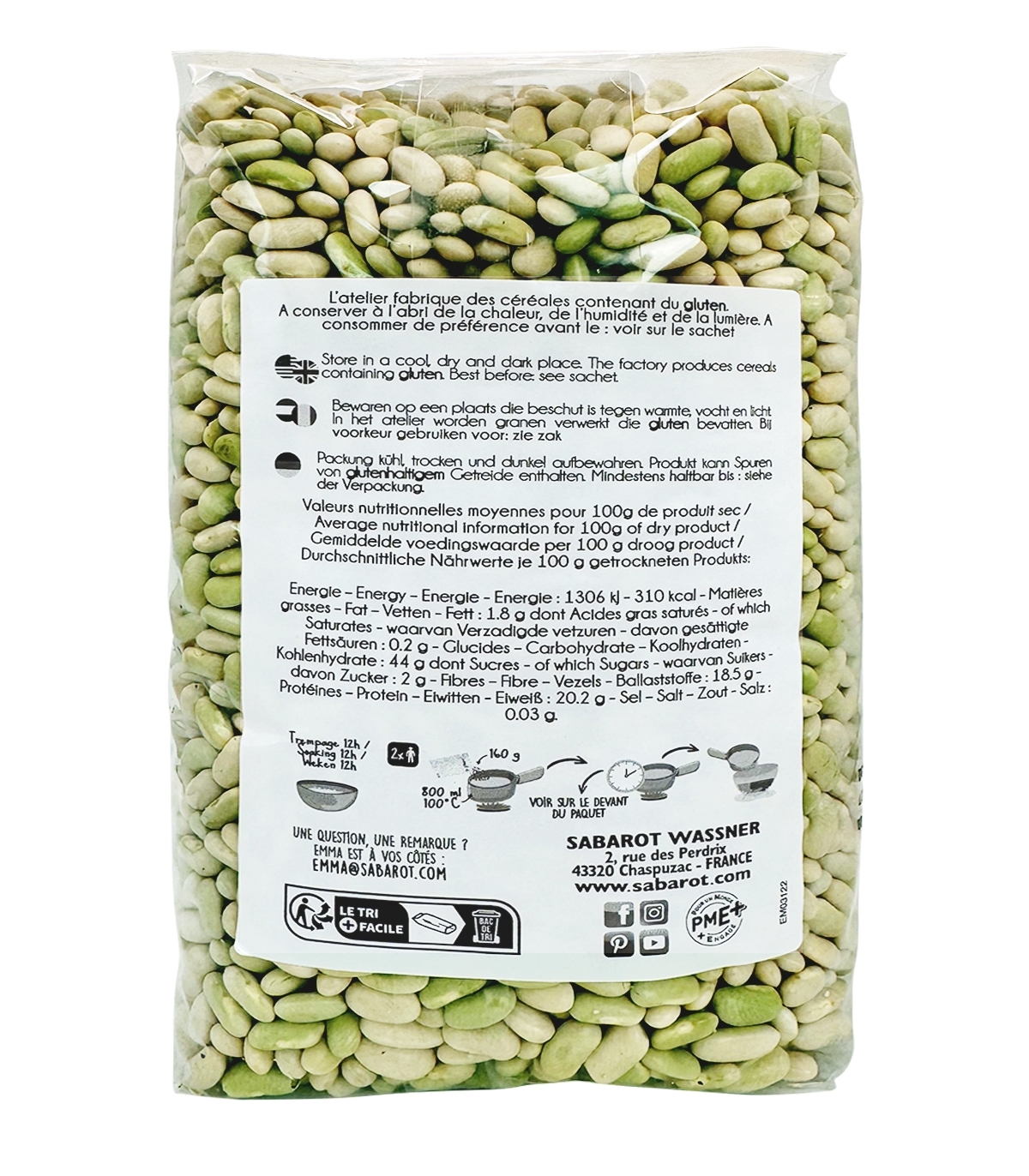 Soaking: overnight. Cook the green flageolets on low heat in 3 times their volume of water for about 90 minutes from boiling. This package contains approximately 12 servings of 80g.