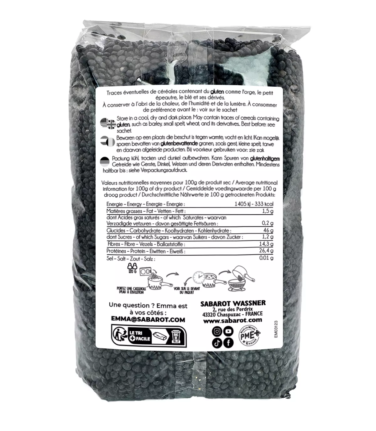 Sur certains paquets les étiquettes se décollent mal .. ce qui empêche de voir le mode d'emploi ! dommage ! <br /> Les lentilles en elles mêmes sont très bonnes ! il faut respecter le temps de cuisson et de préférence les faire dans un premier temps chauffer dans un peu d'huile .