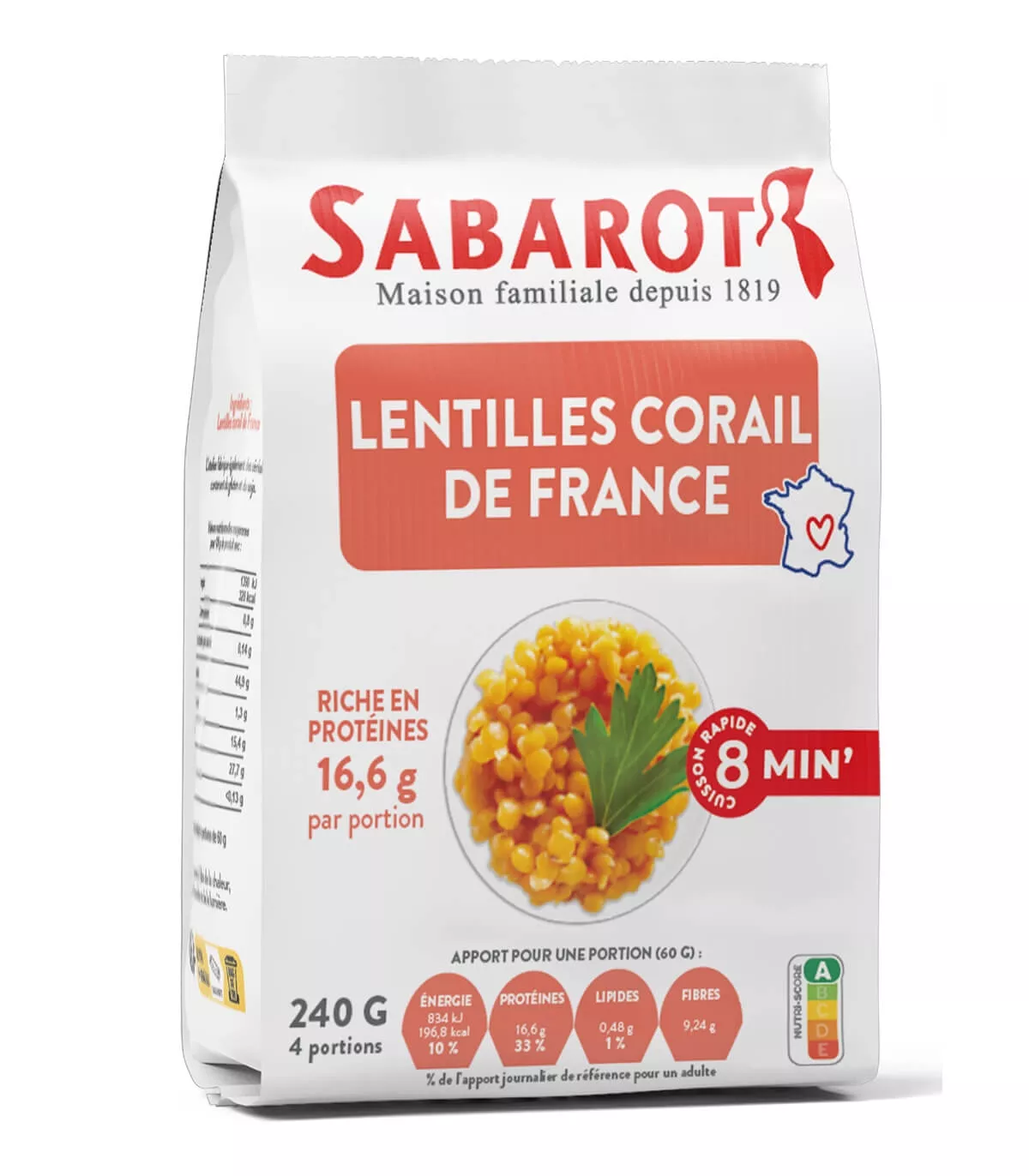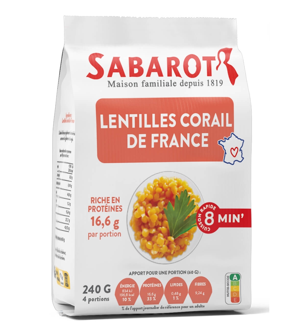 Discover the lentils corail from France Sabarot, in a 240g paper bag. Easy to prepare in 8 minutes, they reveal a tender and flavorful almond. Ideal for your soups, salads, or as a side dish, they bring color, softness, and balance to your meals.