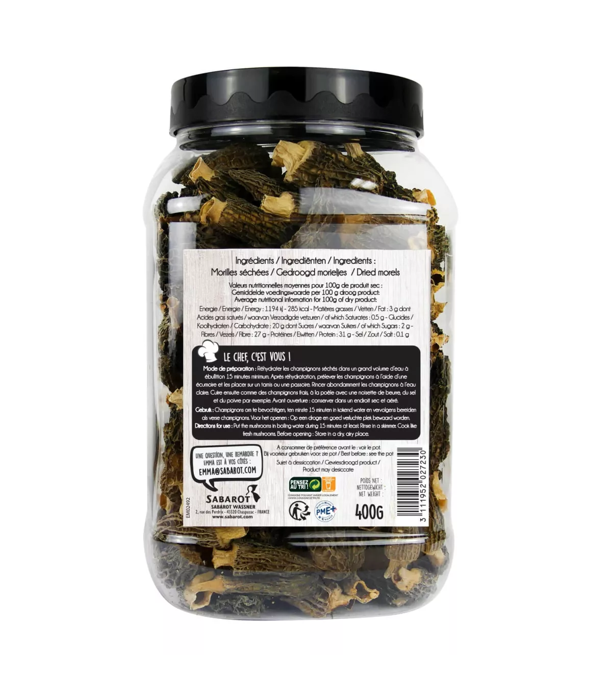The Sabarot morels are selected with the utmost care to offer you a noble product with a powerful taste that pairs wonderfully with your meat or fish dishes, but also enhances simple dishes like potatoes or pasta. The extra morels are whole, allowing you to benefit from all parts of the morel that give it its full aroma. Feel free to use the rehydration water to intensify the taste even further!