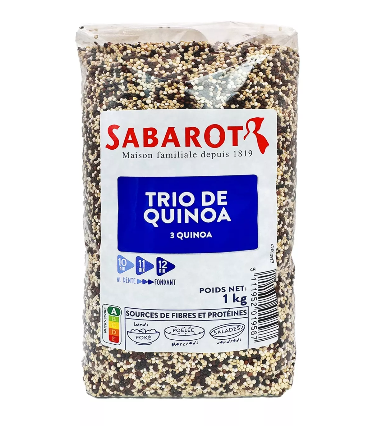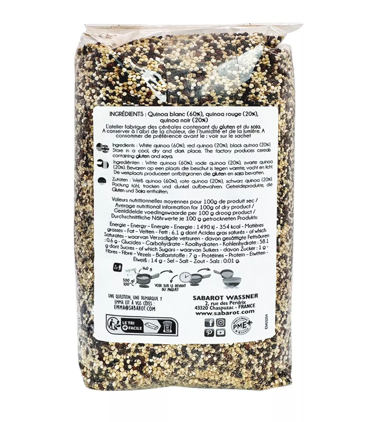 White quinoa, black and red. This product is naturally free of gluten and soy. However, the workshop also processes cereals containing gluten and soy.