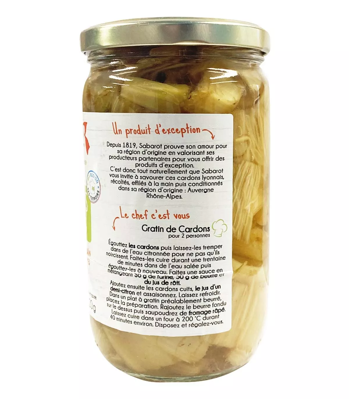 Les cardons Sabarot sont délicieusement faciles d'utilisation. Vous n'avez qu'à les égoutter avant de les cuire une trentaine de minutes dans de l'eau salée avant d'en disposer pour faire de délicieux gratins avec ou sans moelle à la mode lyonnaise.