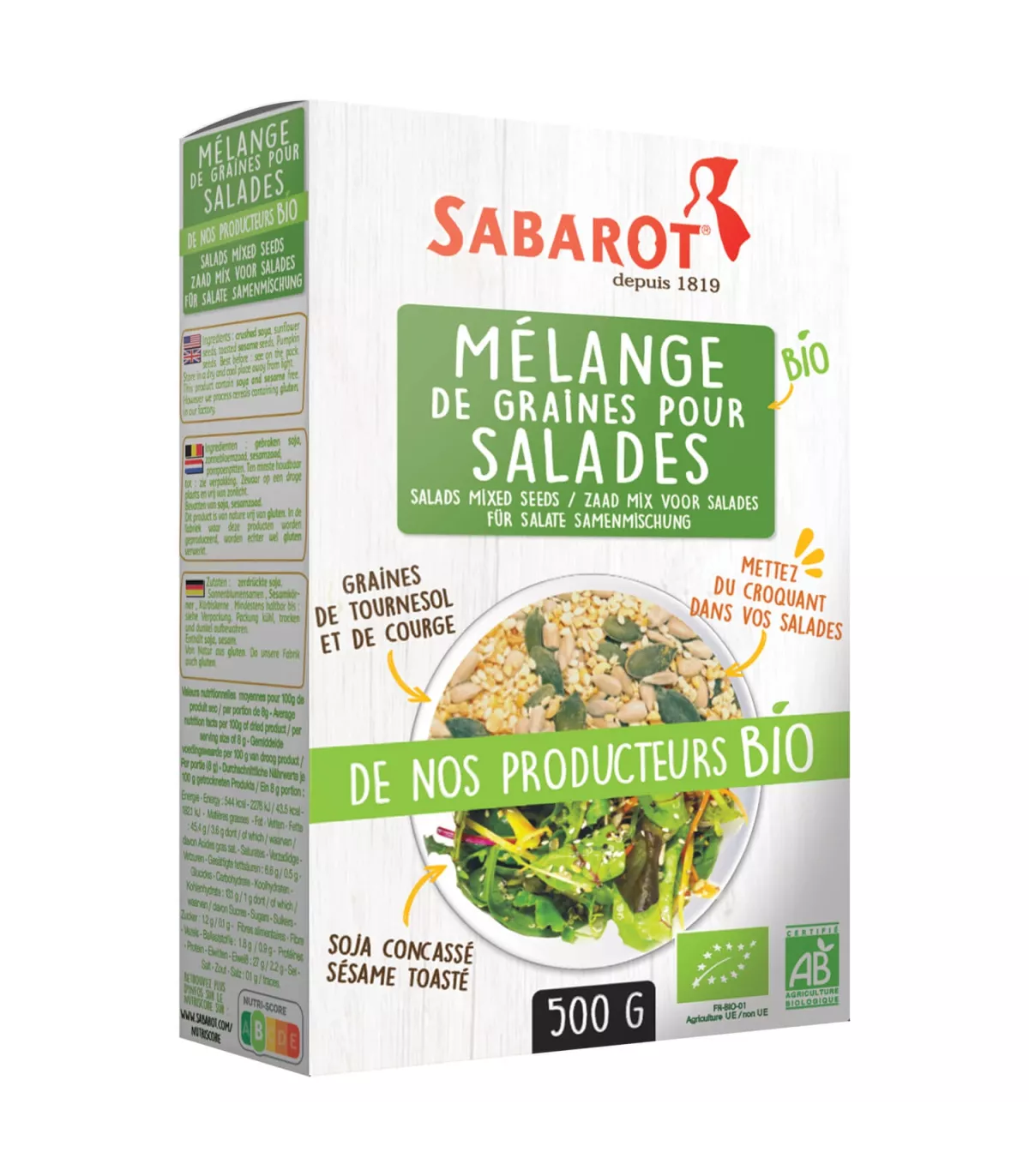 Sabarot vous propose en exclusivité sa gamme de Graines Bio à verser. La solution pratique, ludique et saine pour sublimer vos salades en 2 coups de cuillère à pot, avec des graines de tournesol, de sésame, de courge, et du soja concassé. Ouvrez, versez, savourez ! Ces graines toutes issues de l'agriculture Biologique ont été sélectionnées avec le plus grand soin pour vous offrir le meilleur mélange possible. A verser dans vos salades composées ou natures, les Graines Up' apporteront à vos salades une touche originale et croustillante.