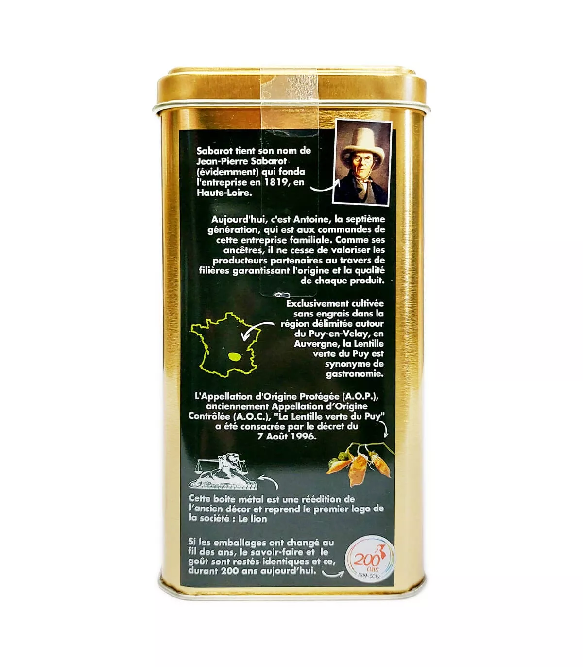 Anciennement AOC et maintenant AOP, la Lentille verte du Puy est issue d'une agriculture respectueuse de l'environnement. Au goût incomparable, elle est reconnue dans le monde par les plus grands chefs. Elle se cuisine aussi bien en salade qu'en plat chaud avec de la viande ou du poisson. Vous pouvez même l'essayer en dessert. Cette boîte métal de 500g de lentilles vertes du Puy est une réédition de l'ancien décor et reprend le premier logo de la société : le lion.