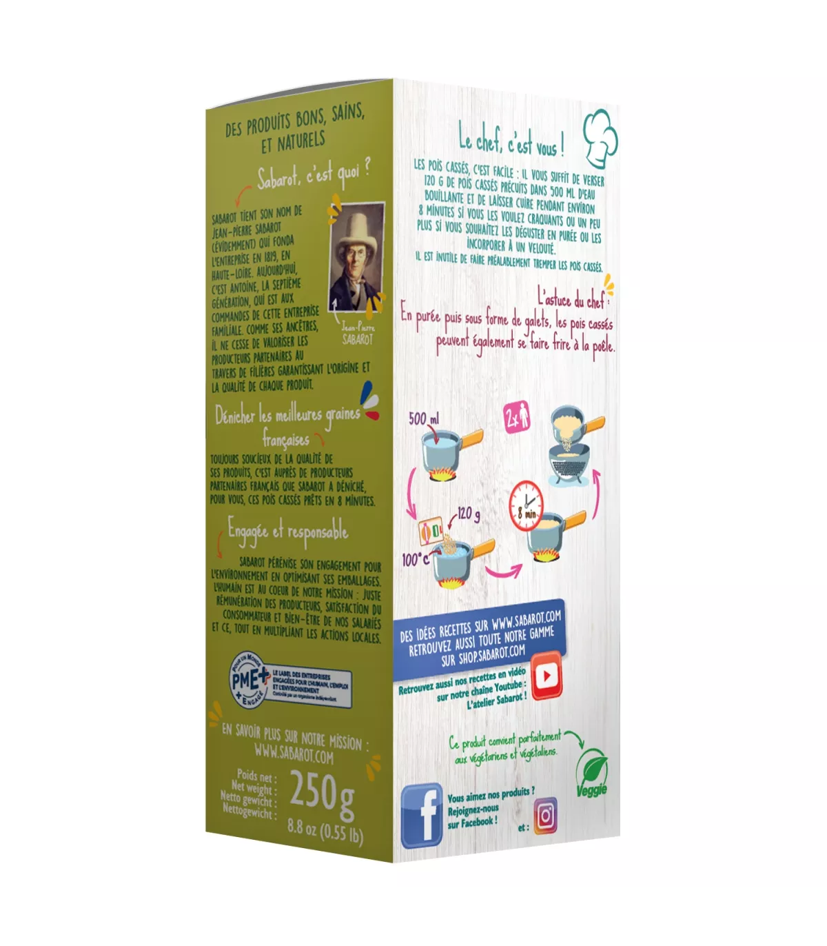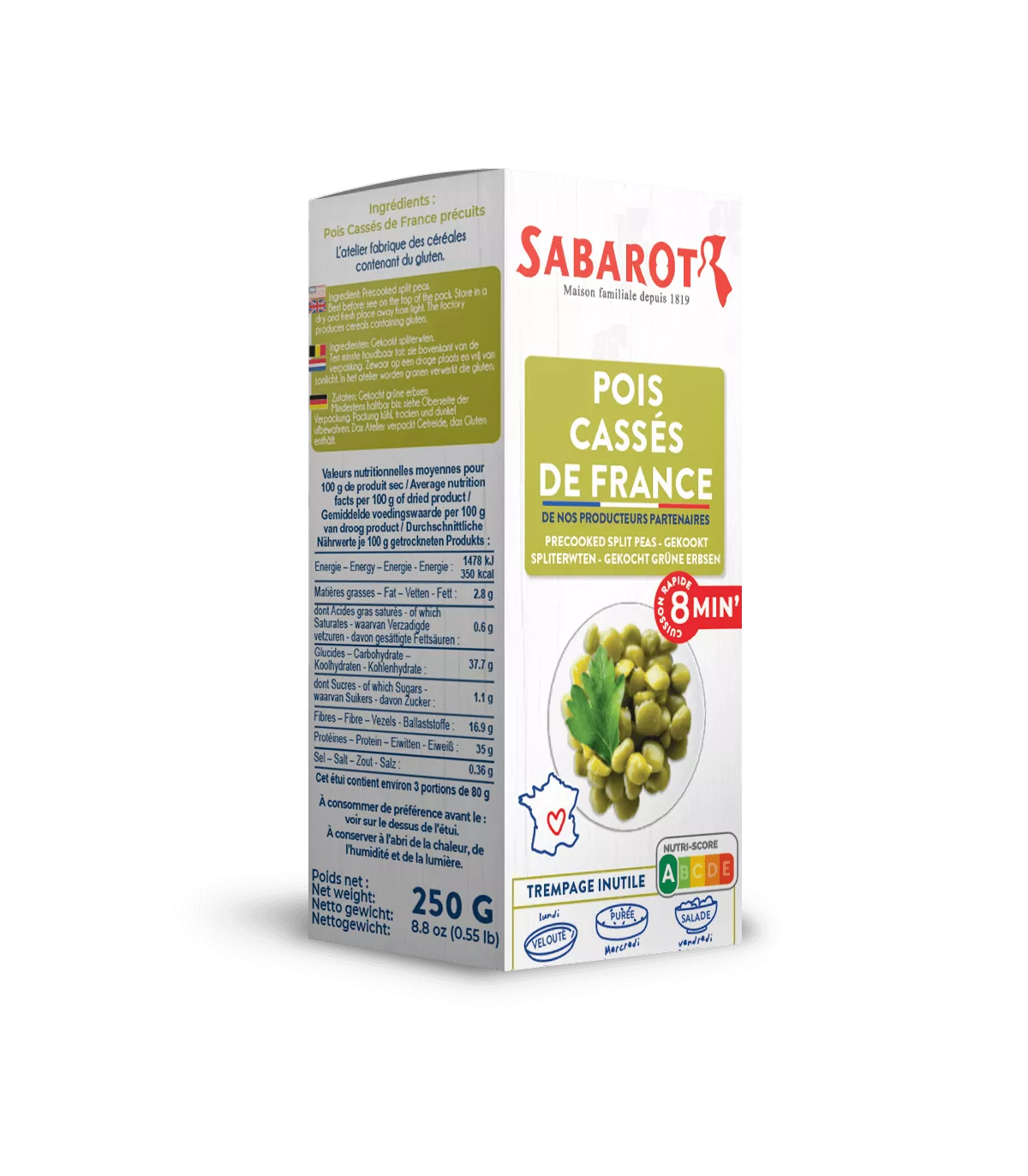 Précuits par un procédé entièrement naturel, les pois cassés "Cuisson rapide" Sabarot voient leur temps de cuisson passer de 35 minutes à 8 minutes seulement ! Plus vite cuit que les pâtes ou le riz, le pois cassé "Cuisson rapide" est idéal en purée, en soupe ou en accompagnement de viandes ou poissons. Il conserve également toutes ses qualités gustatives.