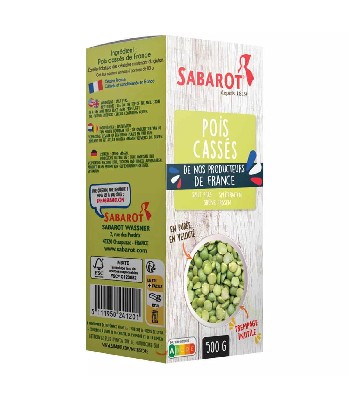 Faire cuire les pois cassés à feu doux dans trois fois leur volume d’eau froide pendant environ 35 minutes à partir de l’ébullition. Ce paquet contient 6 portions de 80g.