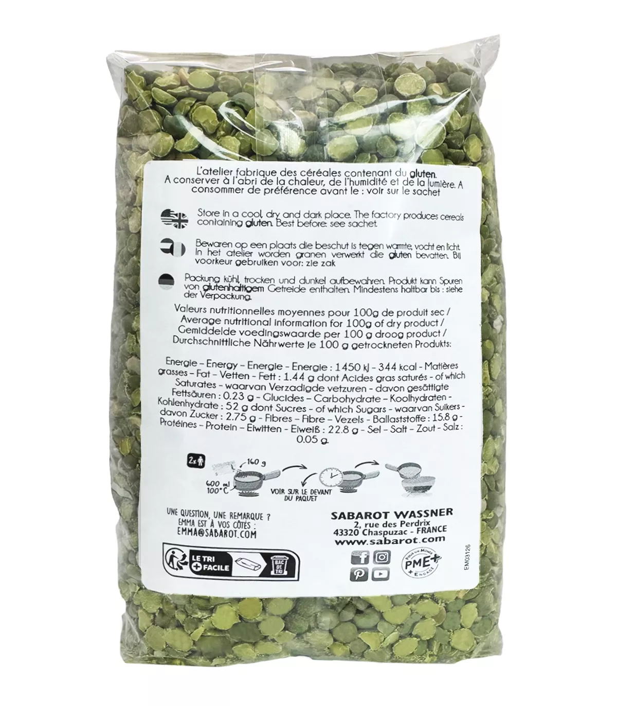 Faire cuire les pois cassés à feu doux dans trois fois leur volume d’eau froide pendant environ 35 minutes à partir de l’ébullition. Ce paquet contient 6 portions de 80g.