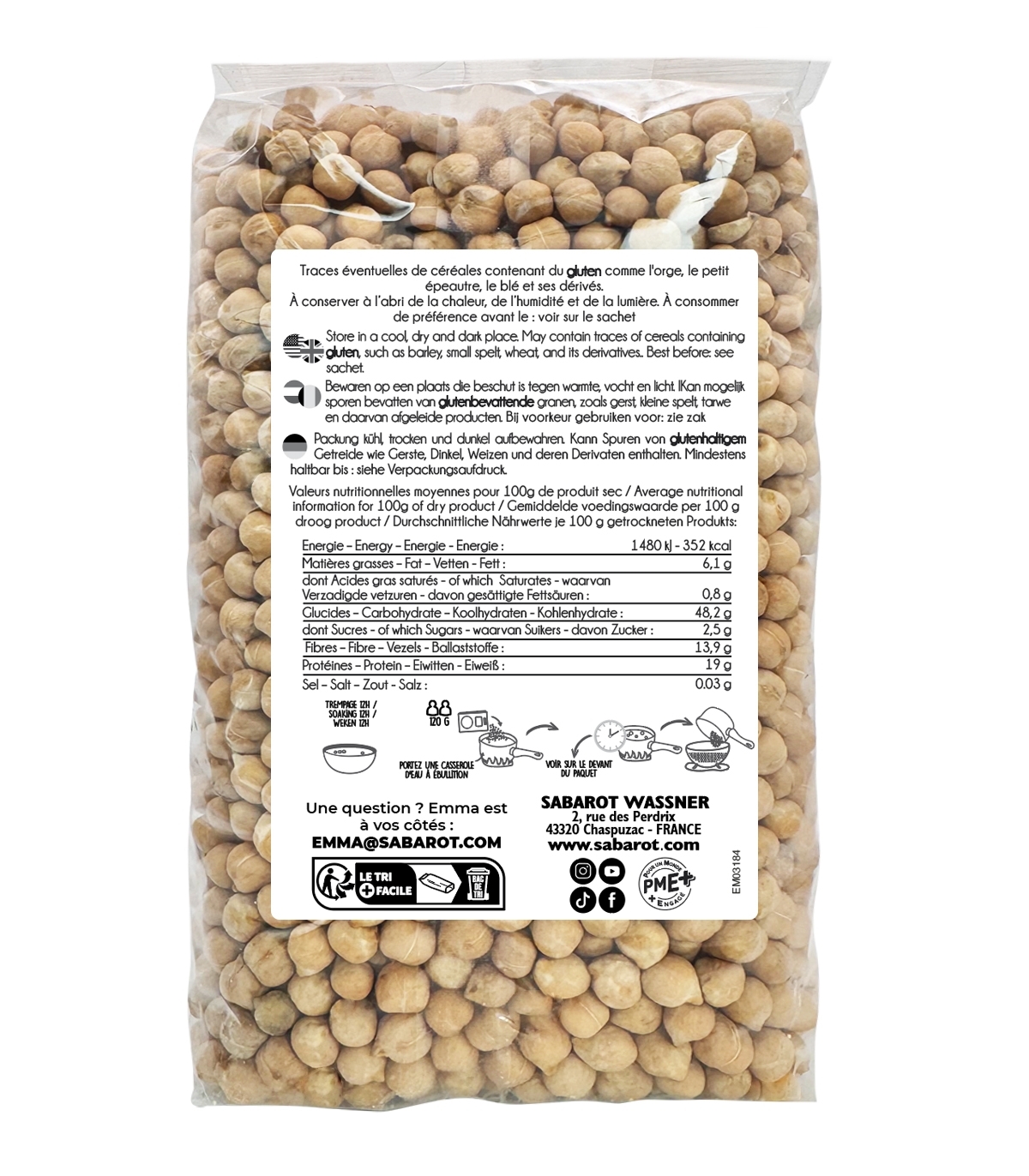 Idéal pour votre houmous, ces pois chiches de taille moyenne (29/30) s'accommodent également avec tous vos plats et salades. Cultivés depuis des millénaires dans le bassin Méditerranéen, et également présents en Inde et au Mexique, les pois chiches entrent dans la composition de nombreuses préparations, entiers ou en farines. Le sol sableux des pays d’Orient donne aux pois chiches des qualités gustatives exceptionnelles.