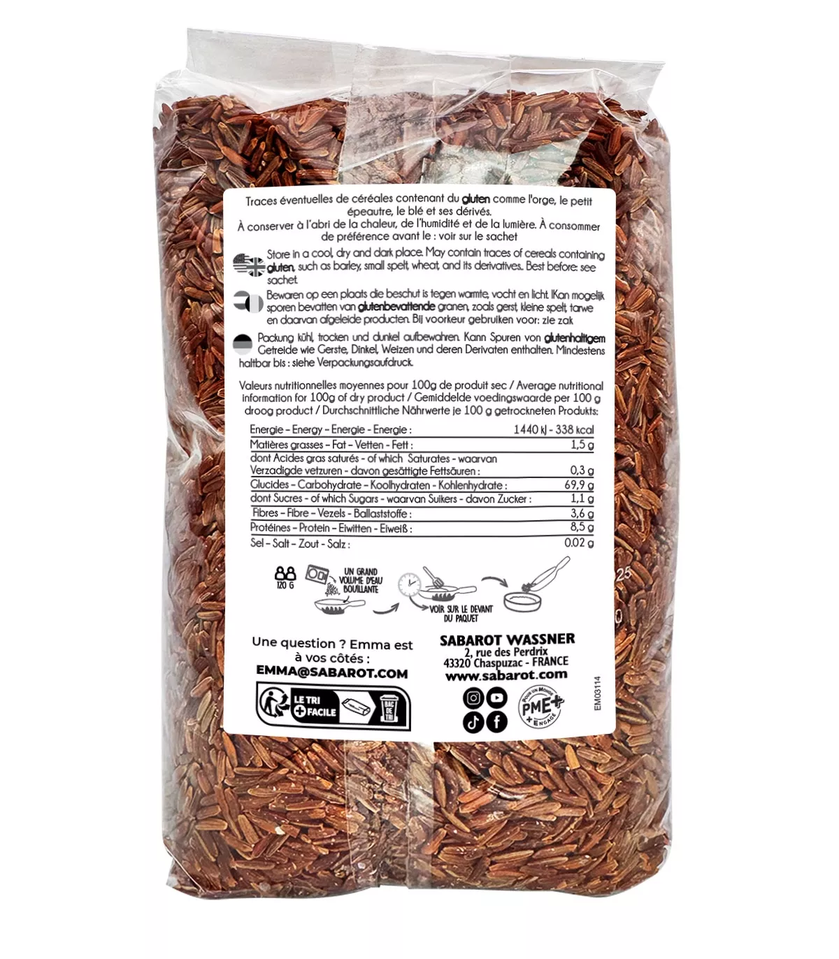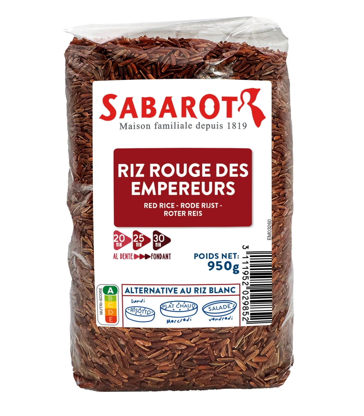 Dans sa gamme "Céréales du monde", Sabarot vous propose en exclusivité le riz rouge des Empereurs. Ce riz originairement réservé à l'Empereur chinois est un riz complet. Il doit sa couleur et ses propriétés nutritives à la peau qui l'entoure. Avec son goût subtil et délicat, il peut-être cuisiné en salade, ou en accompagnement de viandes, poissons ou légumes.